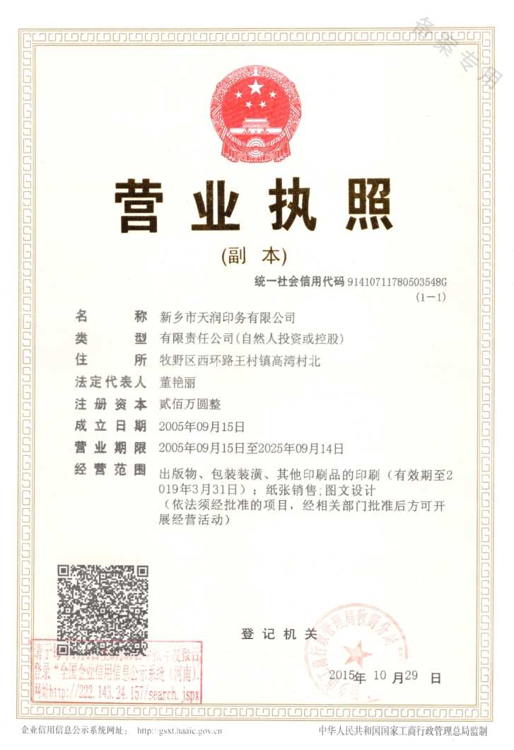 新鄉市天潤印務有限公司,坐落于新鄉市牧野區西環路東側夢溪路2號,緊鄰北環路,為企業的發展提供了便利的交通條件。創建于2005年1月,注冊資金200萬元,是全國書報刊定點**企業。主要從事**物、包裝裝潢、其他**品等**業務。建廠以來公司員工大力弘揚“團結、敬業、務實、創新”的企業精神,開拓進取,艱苦創業,使企業不斷發展壯大,充滿生機和活力。全廠現有員工80多名,其中****技術人員15余名,技術骨干人員10余名;占地面積10000余平方米;建筑面5500平方米;其中辦公面積300平方米,住宿和員工活動室500平方米,生產車間面積4700平方米; 公司成立以來在各級領導的關心和支持下,不斷發展和壯大,擁有大對開2+2海德堡彩印機、四開海德堡彩印機,北人204D雙色輪轉**機、北人JJ4...